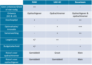 Bij UAV-GC heb je de grootste kans op de laagste prijs, mits je de expertise van de opdrachtnemer maximaal tot zijn recht laat komen. Bij RAW heb je vaak wel een lage prijs maar is er regelmatig een aanzienlijke hoeveelheid meerwerk en mis je de inbreng van de aannemer om kosten te besparen, die besparingsmogelijkheid heb je bij een UAV-GC contract en bouwteam wel.